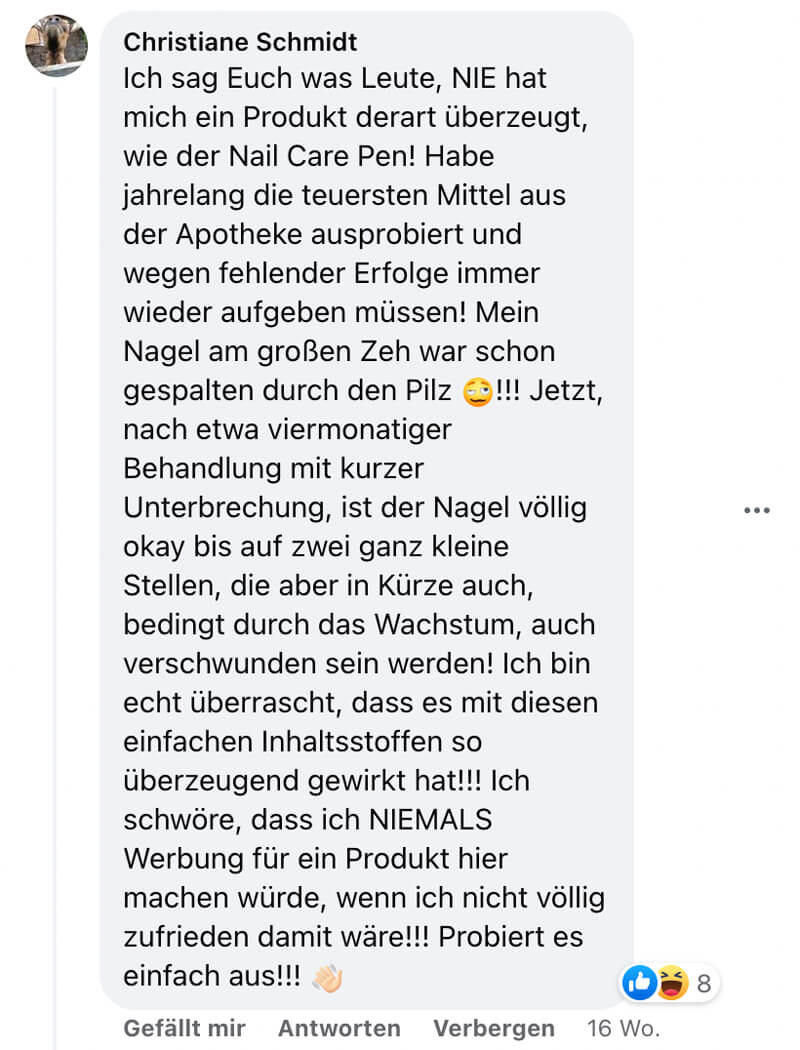 Ich leide nun seit ca. 10 Jahren an Nagelpilz. Ich hatte in den vergangenen Jahre viele Produkte von der Apotheke und ärztlich verschriebene Tabletten und Lösungen ausprobiert. Alles bislang erfolglos gewesen. Im vergangenen Sommer bin ich durch Zufall auf das Produkt gestoßen und war sehr skeptisch. Nachdem ich so viele Bewertungen durchgelesen habe und dem Kundenservice geschrieben habe, war die Hoffnungen wieder geweckt den Pilz endgültig los zu werden. Nun nehme ich den Pen seid Ende Oktober und bin absolut begeistert 🙂 nach vier Wochen war ein richtig gutes Resultat bereits zu sehen. Der gesunde Nagel wächst schön raus und der Pilz verschwindet von Monat zu Monat immer mehr :). Ich bin so begeistert und habe den Pen gleich im Familienkreis weiterempfehlen. Ich freu mich schon auf den Sommer, wenn ich endlich wieder offene Schuhe tragen kann und der Pilz endgültig Geschichte ist.