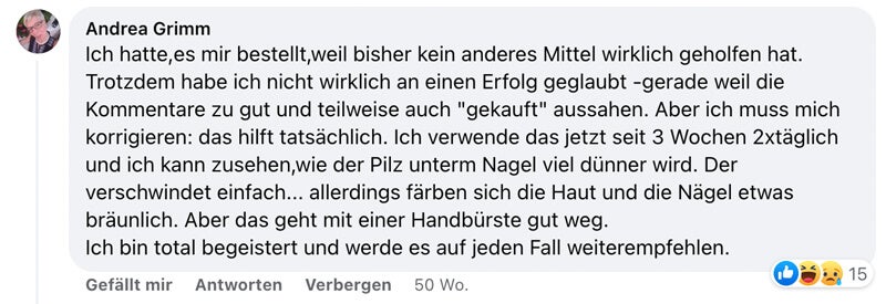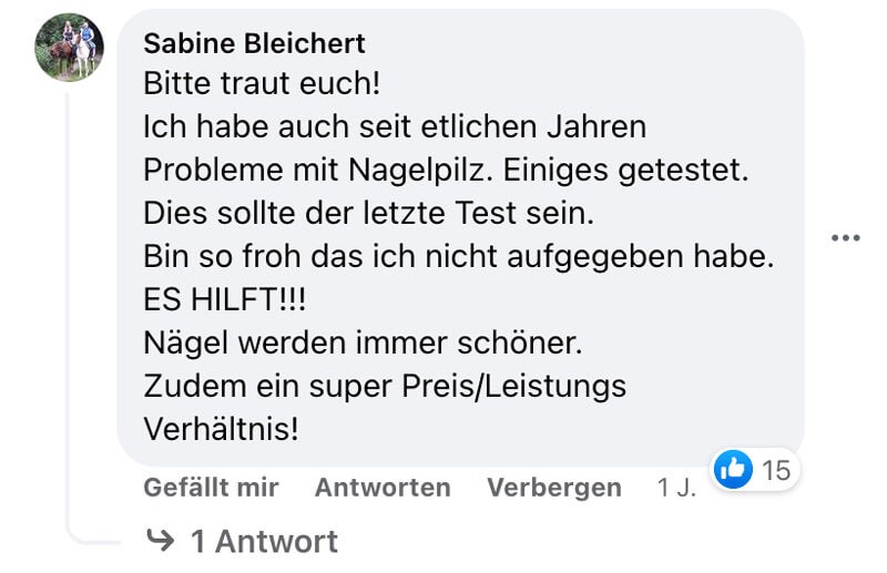 Es ist wirklich super das Produkt, schon nach ein zwei Wochen konnte man eine Verbesserung feststellen. Jetzt ist der Pilz schon fast weg, ich werde es mir wieder holen. Kann das Produkt nur weiter empfehlen.
