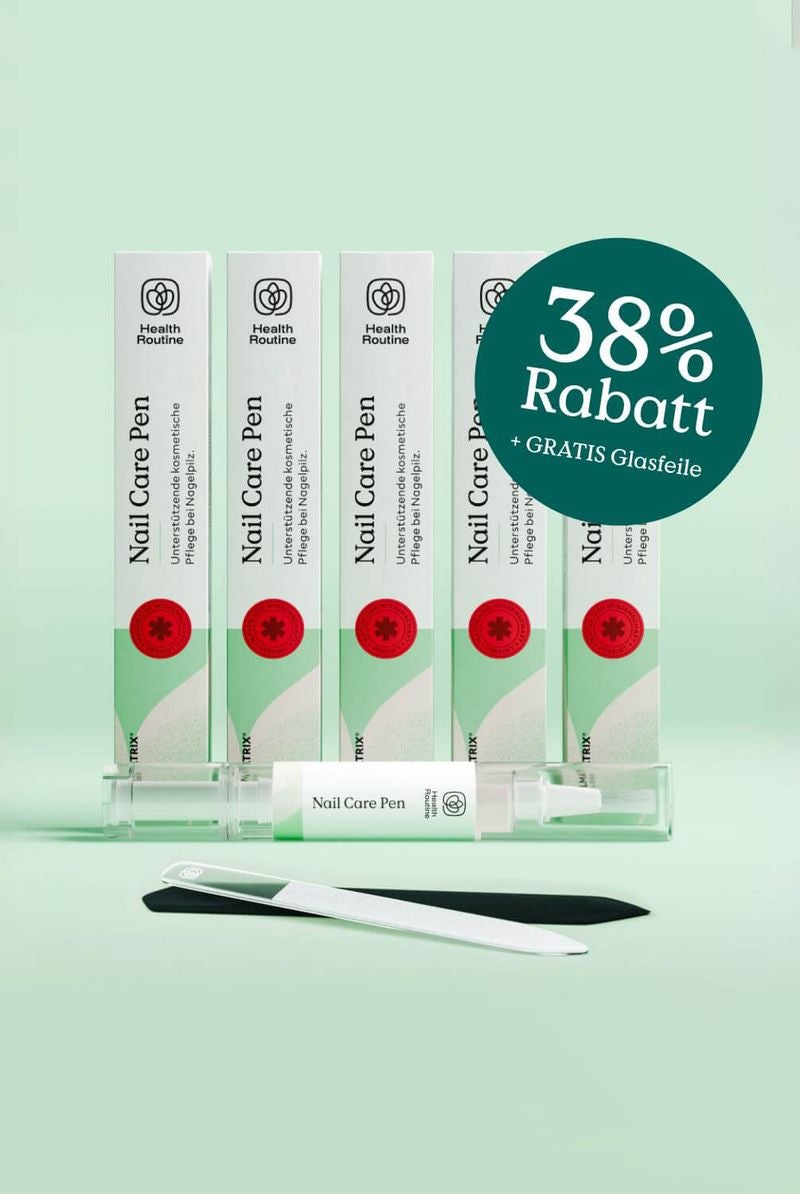 Nagelpilz lässt sich leider nicht von heute auf morgen vollständig behandeln. Die größten Erfolge erzielen unsere Kunden deshalb meistens mit der 5-Monate-Kur. Aus diesem Grund verkaufen wir diese aktuell noch zu einem speziellen Sonderpreis und schenken Dir zusätzlich noch unsere Aktivator-Glasfeile. Dadurch ist garantiert, dass Du die besten Resultate erzielst und gleichzeitig noch eine Menge sparst.